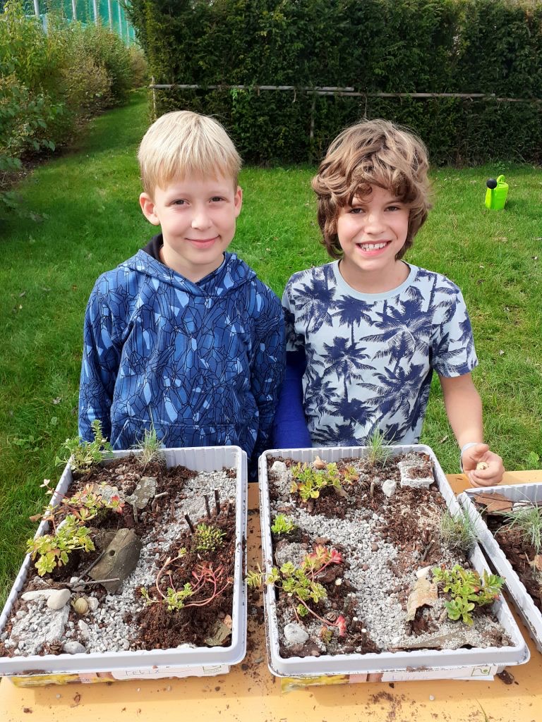 Die 4b der Grundschule im Ebnet war am Mittwoch 25.10. nochmals bei einem workshop im Grünen Klassenzimmer. Thema war „Traumgärten in der Kiste“. Nachdem zwei Landschaftsgärtnerinnen die Kinder durch die angelegten Gärten beim Treffpunkt Grün geführt hatten und Ideen gesammelt werden konnten, kam noch ein klein wenig Theorie zur Gartengestaltung. Dann ging es aber auch schon mit der Praxis los und jeder durfte seinen eigenen Garten auf 30x40cm gestalten. Es standen eine ganze Reihe an Materialien zur Auswahl. Bei Kies, Kiesel, kleinen Pflastersteinen angefangen, über Hackschnitzel, Rindenmulch, Ästchen, Rinde, Zäpfchen, Sand bis hin zu klein bleibenden Dachbegrünungspflanzen und Sämereien. Sogar Teichfolie war vorhanden. So konnten die 17 Kinder der Klasse ihrer Phantasie freien Lauf lassen und alle waren mit viel Eifer und Spaß bei der Sache. Die Zeit verging schnell und am
